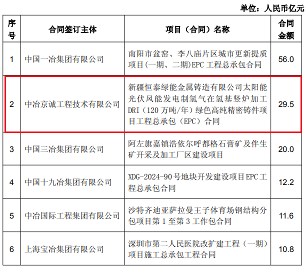 其中,2025年11月,中冶京誠(chéng)工程技術(shù)有限公司簽新疆恒泰綠能金屬鑄造有限公司太陽(yáng)能光伏風(fēng)能發(fā)電制氫氣在氫基豎爐加工DRI(120萬(wàn)噸/年)綠色高純精密鑄件項(xiàng)目工程總承包(EPC)合同,合同金額29.5億元。