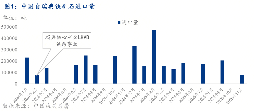 中國海關(guān)數(shù)據(jù)顯示,2025年中國自瑞典進(jìn)口鐵礦石數(shù)量較2024年同期明顯回升。2025年1-11月中國自瑞典鐵礦石進(jìn)口量為156萬噸,同比增長22.8%,但從絕對量水平看,該階段的進(jìn)口規(guī)模仍低于2023年同期的180.1萬噸,整體尚未恢復(fù)至此前水平。