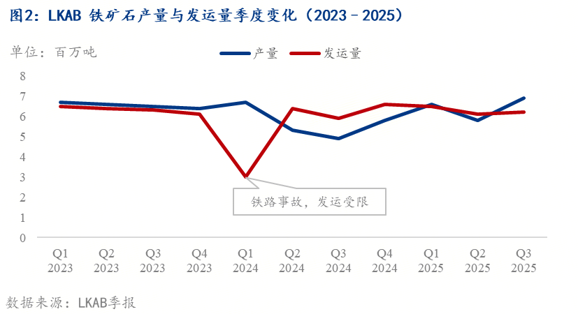 2025年內(nèi),隨著運(yùn)輸條件逐步恢復(fù),前期受阻的發(fā)運(yùn)節(jié)奏明顯改善。2025年前三季度,LKAB累計(jì)發(fā)運(yùn)鐵礦石約1880萬噸,較2024年同期的約1520萬噸顯著增加。同期,其鐵礦石產(chǎn)量恢復(fù)性回升,但整體水平與2023年基本相當(dāng),顯示供應(yīng)改善更多來自物流端修復(fù),而非新增產(chǎn)能釋放。