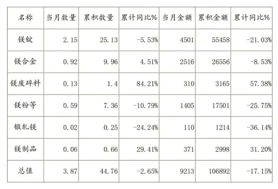 2025年我國鎂產(chǎn)品出口呈現(xiàn)“量價齊跌”特征: