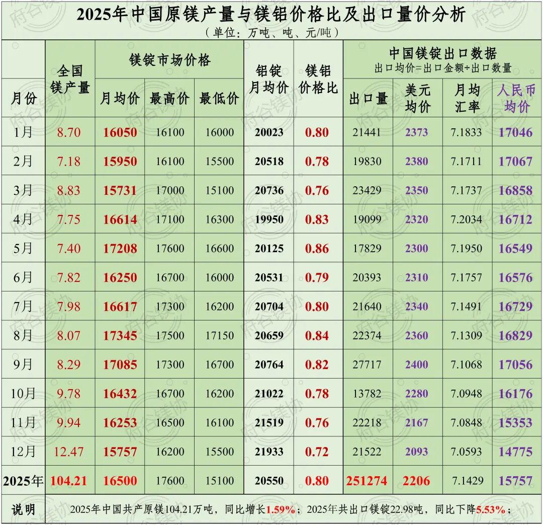 從行業(yè)核心運行指標分析,2025年原鎂市場呈現(xiàn)產(chǎn)量增長、鎂鋁比價走弱的特征,疊加匯率波動影響,原鎂出口端面臨多重壓制,行業(yè)競爭格局進一步承壓。