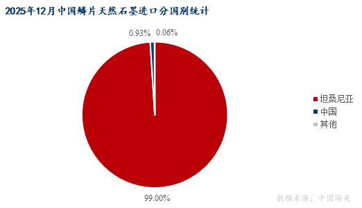 2025年12月天然鱗片石墨進(jìn)口的2608.911噸,從坦桑尼亞進(jìn)口量最大,占比為99.00%,從中國(guó)進(jìn)口量占比為0.93%,其他貿(mào)易伙伴進(jìn)口總量為0.06噸,總占比不足1%。
